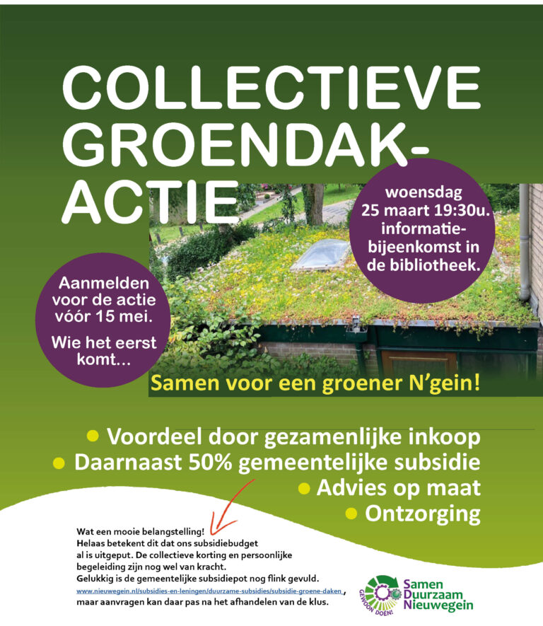 Nieuwegeinse grijze daken van schuurtjes en garages die veranderen in groene en fleurige minituintjes! Veel vierkante meters natuur extra in onze stedelijke omgeving? Hoe leuk zou dat zijn! We hebben daarom een groendakplan uitgewerkt, samen met Het Groene Loket. Wil je er meer over weten? Bekijk … lees verder >> overInfo-avond op woe 25 maart in de bibliotheek