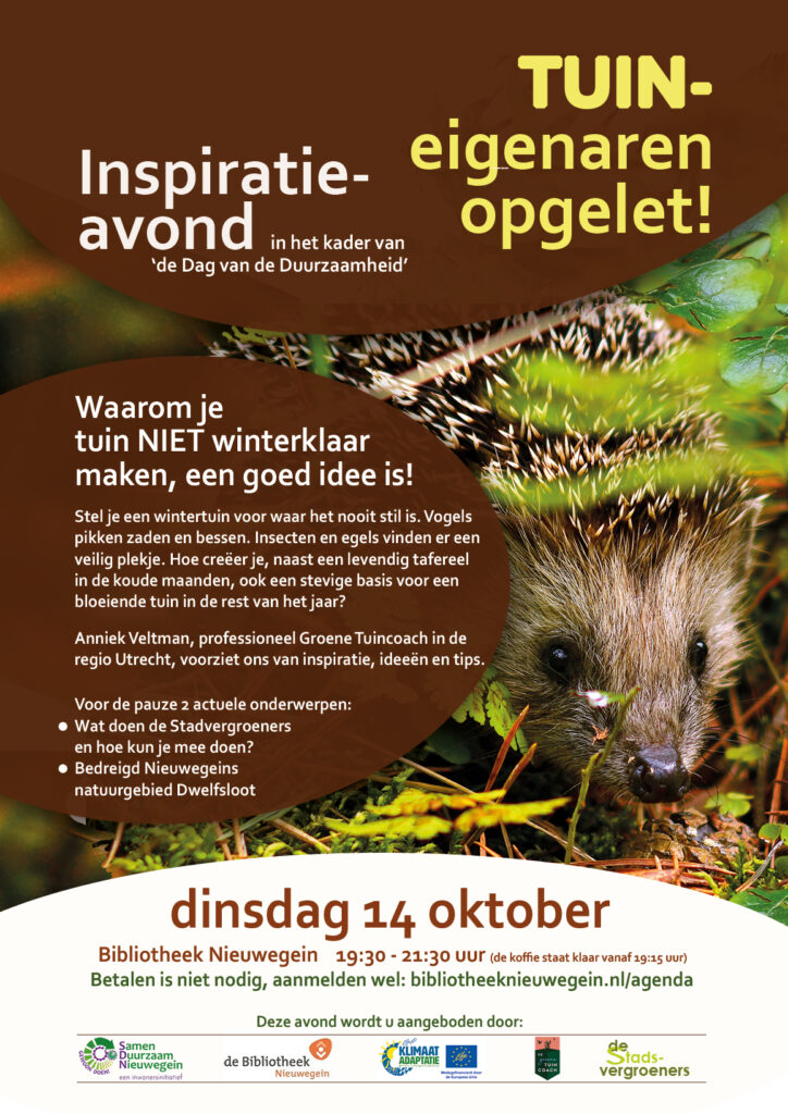 Een kale en strak opgeruimde tuin in de winter? Liever niet! Op dinsdag14 oktober organiseren Samen Duurzaam Nieuwegein en de Bibliotheek, samen met Life-ip en De Stadsvergroeners, in het kader van de Dag van de Duurzaamheid, een inspiratieavond over het belang van een levendige wintertuin. Professioneel Groene Tuincoach Anniek Veltman laat zien waarom het verstandig is om je tuin juist niet strak winterklaar te maken. Een tuin die in de winter wat rommeliger mag zijn, zit vol leven. Vogels vinden er zaden en bessen, insecten en egels vinden beschutting. Zo wordt de tuin in de koude maanden een levendig tafereel én ontstaat er een stevige basis voor een bloeiende tuin in de rest van het jaar.